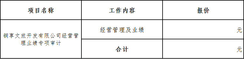針對(duì)貴公司對(duì)銅享文旅開(kāi)發(fā)有限公司經(jīng)營(yíng)管理業(yè)績(jī)專(zhuān)項(xiàng)審計(jì),我所報(bào)價(jià)如下: